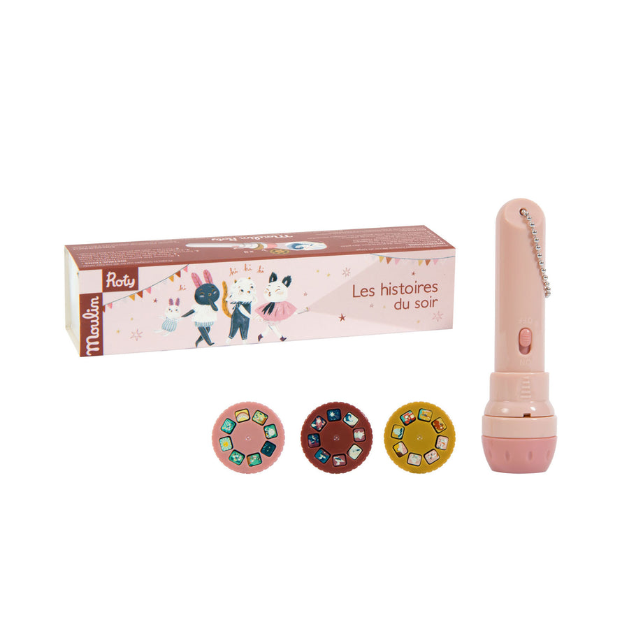 Flashlight with 3 interchangeable discs, which are projected on the wall and each contains its own story. The lamp is easy to use: Insert a disc into the lamp, turn on the lamp and you can see the pictures on a wall or in the ceiling.